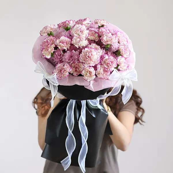 Mauve Memoir is an elegant composition of soft mauve chrysanthemums and ruffled purple and white shaded carnations, gathered in cloud-soft layers of blush pink tissue and black frosted wrap. Finished with a white pearl-edged ribbon bow, it is a graceful arrangement that speaks in hushed tones, like a memory held gently in bloom.