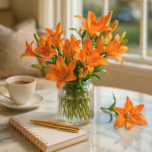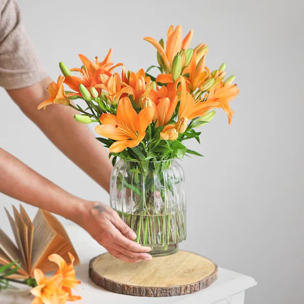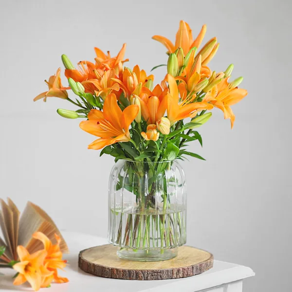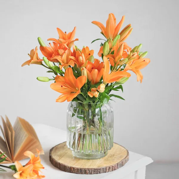 There is a music to colour when the day begins to fade, and Sunset Sonata captures that fleeting beauty in full bloom. Eight vivid orange Asiatic lilies open like flames against the sculpted lines of a ribbed glass vase, every petal echoing the warmth of a sunlit crescendo. Presented in a luxury box, it feels like the golden hour paused, held in a single, resounding note. Note – Our lilies will be delivered in a semi-bloomed state.